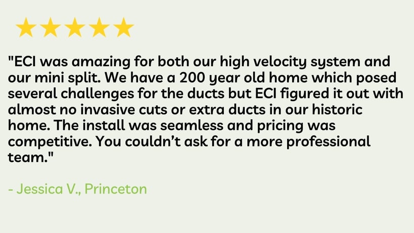 "ECI was amazing for both our high velocity system and our mini split. We have a 200 year old home which posed several challenges for the ducts but ECI figured it out with almost no invasive cuts or extra ducts in our historic home. The install was seamless and pricing was competitive. You couldn’t ask for a more professional team."